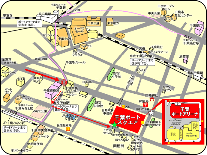 | 交通アクセス | ●JR総武線千葉駅より徒歩16分または、千葉海浜交通バス・小湊鉄道バスを利用して「ポートアリーナ」下車。 ●JR京葉線千葉みなと駅より徒歩15分または、千葉海浜交通バス・小湊鉄道バスを利用して「ポートアリーナ」下車。 ●京成線千葉中央駅より新宿プロムナードを利用して徒歩12分。 ●千葉モノレール市役所前駅下車徒歩8分。 お車で来館する方は・・・ ●ポートアリーナ地下有料駐車場(1時間400円) ●農協前民間有料駐車場(1時間100円、1日最大600円) ●(※千葉市役所閉庁日は、)市役所有料駐車場 (30分50円、1日最大600円) などがあります。 |